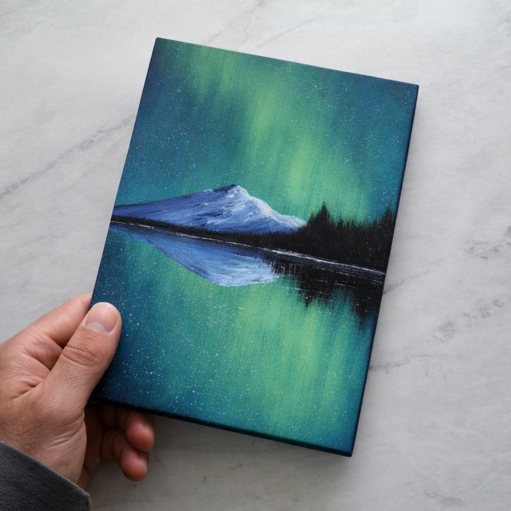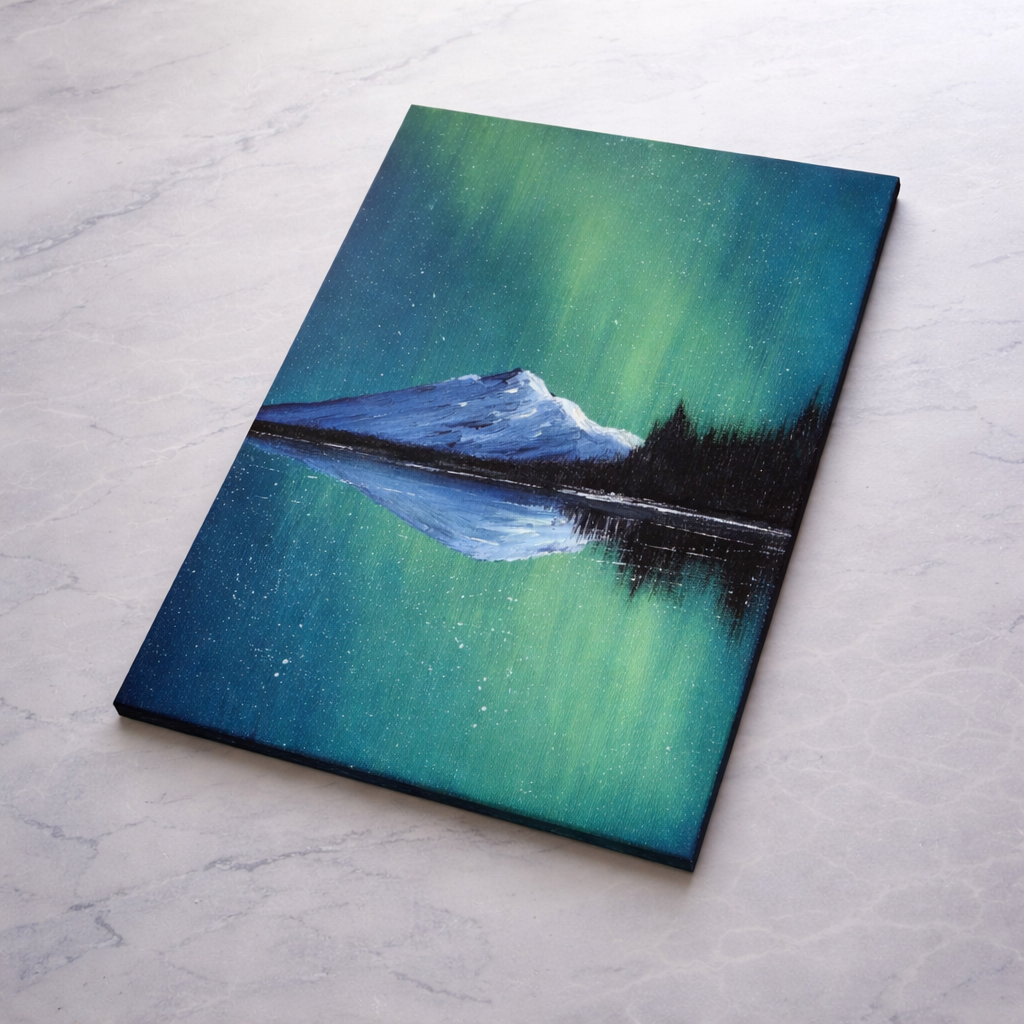 Experience the serene beauty of the northern lights with this stunning handmade acrylic painting. A snow-covered mountain stands peacefully beneath a glowing green aurora sky, perfectly reflected in the calm lake below.